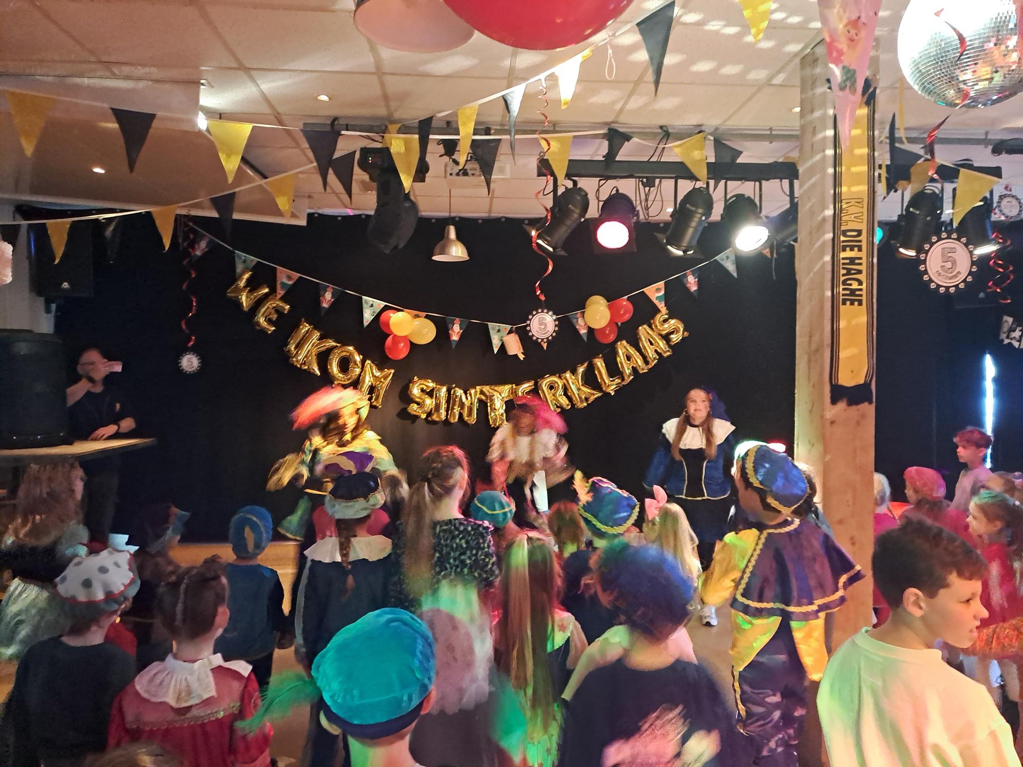 Na nog wat gedanst en gezongen te hebben kwam het bericht dat Sinterklaas in aantocht was. Een erehaag werd gemaakt en het welkomstlied werd hard ingezet.