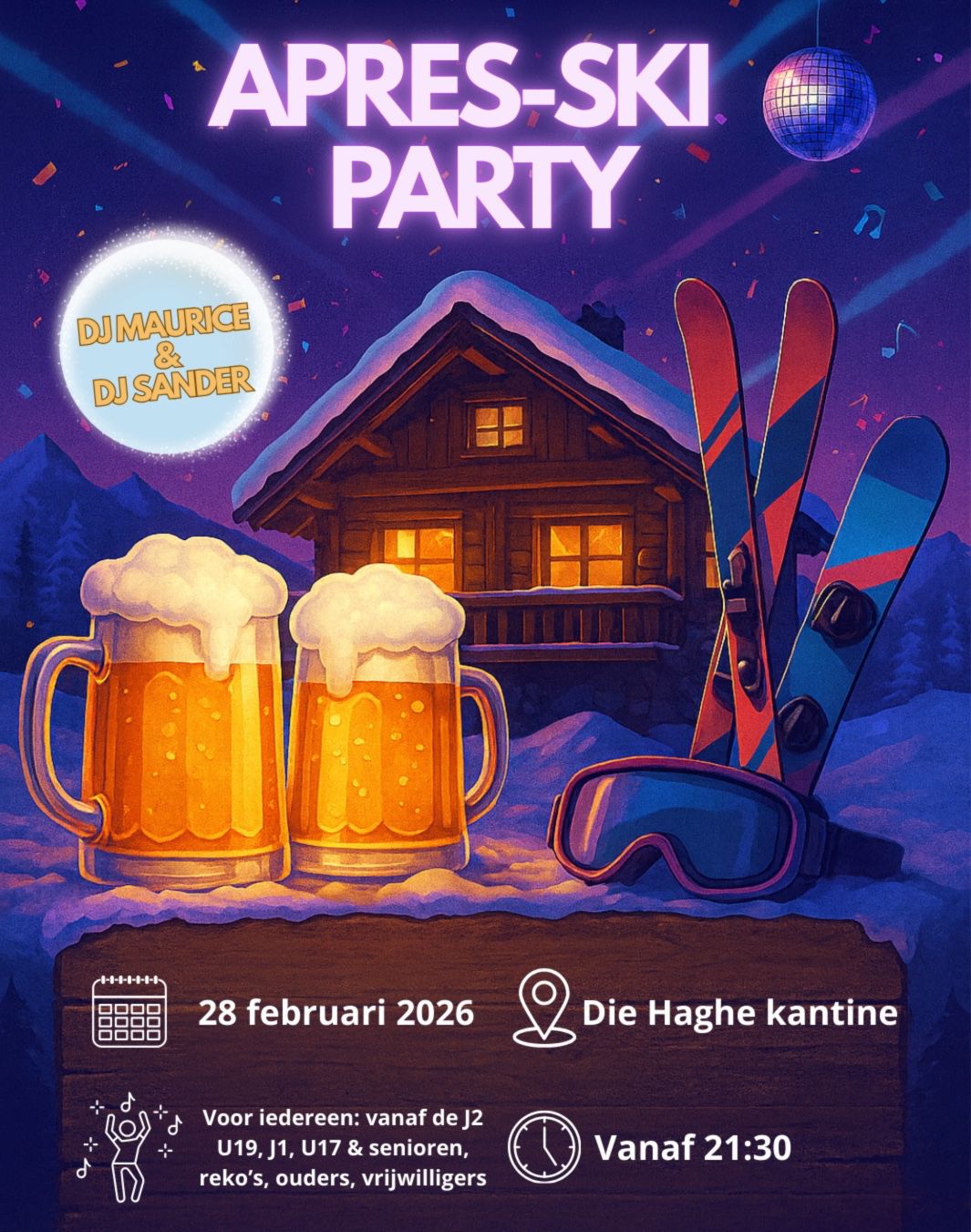 Trek je mooiste après-ski outfit aan, want we maken er samen een supergezellige avond van. Zorg dat je erbij bent! ❄️🍻🏔️